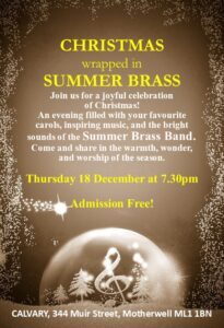 Christmas Carol Concert with Summer Brass Join us for our annual evening of festive music and holiday cheer at Calvary Motherwell! Experience the magic of Christmas as Summer Brass sounds fill the church with joyful carols and seasonal favourites. Thursday, 18th December7:30 PMCalvary Motherwell Bring your friends and family for a wonderful night of music, …